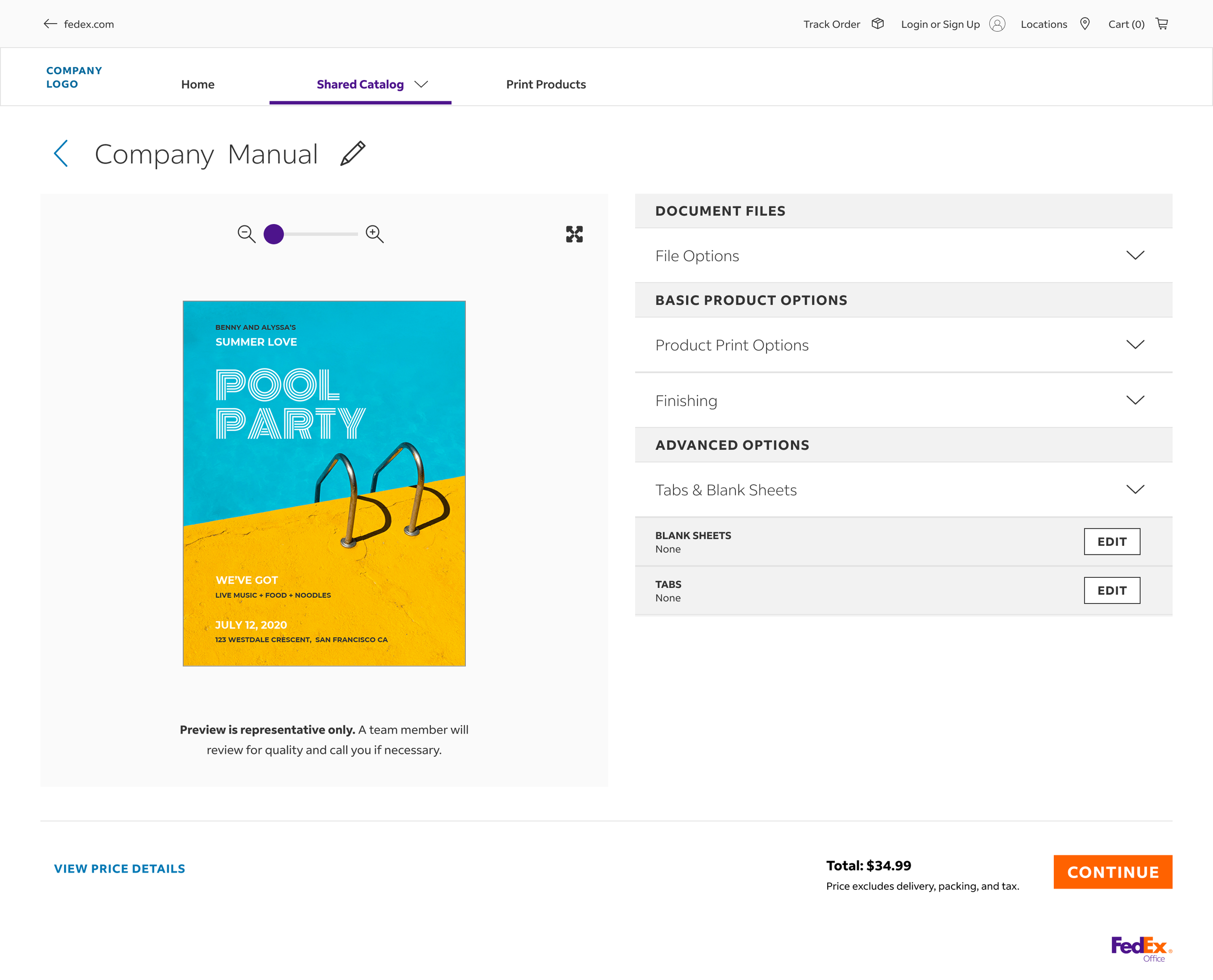 This is the shared catalog page where users can place print orders that are configured by their admin employees at their company.